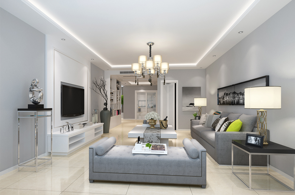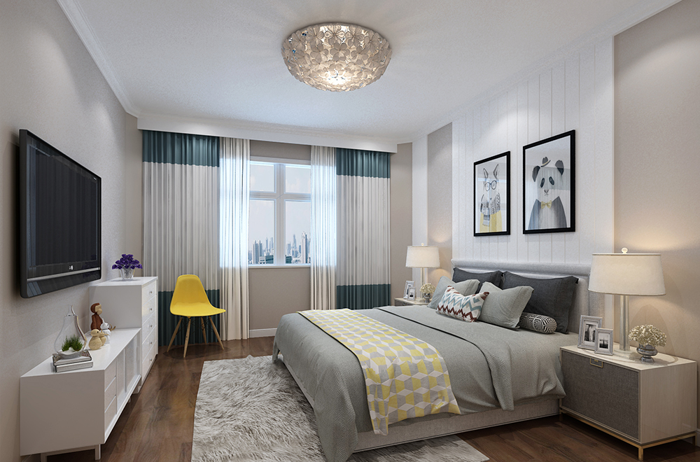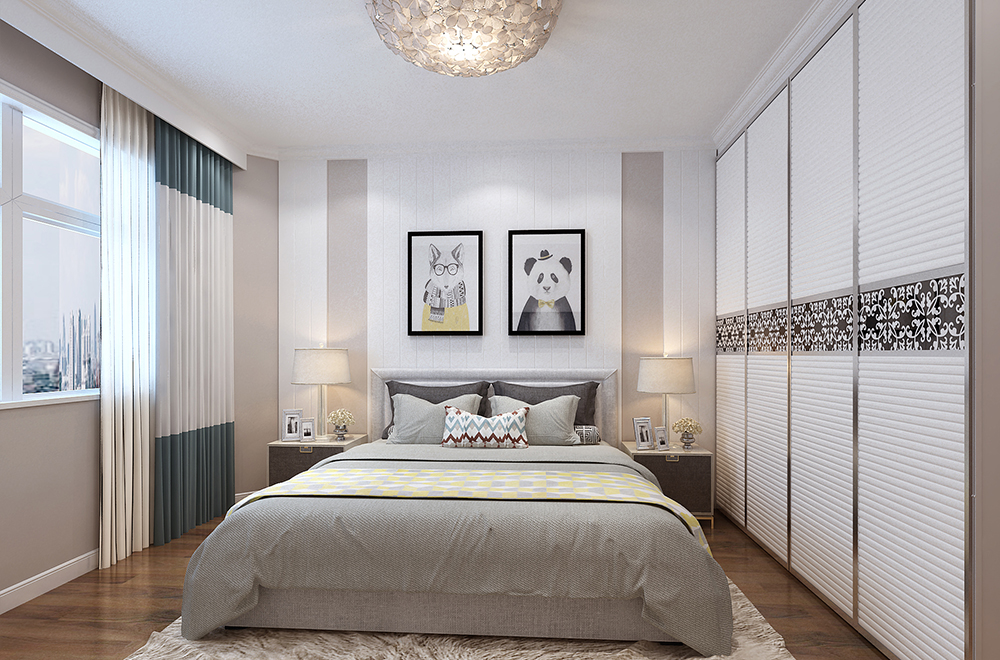 在整个户型的平面功能设计中业主重点考虑的是以实用为主,强调收纳储藏功能,所以我把原户型中的厨房扩大,增大整体厨房空间,因为户型门厅空间比较大,业主感觉这部分空间有点浪费,缺少实用性,所以我在门厅空间增加个储物间,这样第一可以增加储藏功能,第二弥补了门厅空间不方正,角多的问题。客厅空间原本不是很大,还有个阳台,为了使客厅空间变大,更具有视觉效果我把原有阳台和客厅之间的墙体拆除,把阳台空间取消融入客厅空间,使客厅空间更为开阔。剩下两个朝南的卧室分别为主卧室和孩子的房间。整套户型卧室都偏小,为了在视觉上增大空间,主卧室的背景墙我采用石膏板造型做竖向纹理,用颜色突出背景墙的立体感同时增减的房间的高度视觉比例。朝北的卧室为书房兼客房功能,因为平时很少有客人留宿,所以设计的时候没有考虑床的位置,改为订做榻榻米,这样平时可以作为休闲的区域,还兼备的收纳的功能,同时有客人留宿的时候还能兼备客房。这套户型为双卫,因为平时就业主两口居住,孩子在国外留学